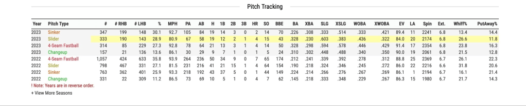 Moanah’s slider was his putaway pitch in 2021 & 2022. Borderline unhittable in ‘21 opponents hit .146 against it and in ‘22 just .190. Well the riff rate has gone down this year and in 2023, they are hitting .328 and slugging .603 off of his slider. To put that in perspective that would be the third highest slugging percentage in the majors.