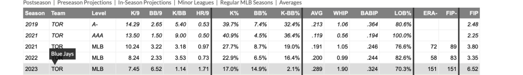 Manoah’s control hasn’t been there this season. His walk rate is at 14.9%, BB/9 is at 6.5, both of those numbers are up dramatically not only from last year, but also his career. His 42 walks are almost as high as his entire 2022 total (52 in 196 innings). Pair that with an inability to miss bats (K/9 and Strikeout Percentage both are down, even though velocity is the same. Manoah is getting hit harder and more often because he finds himself down in the count. Which leads to the much high batting average on all his pitches across the board in 2023.