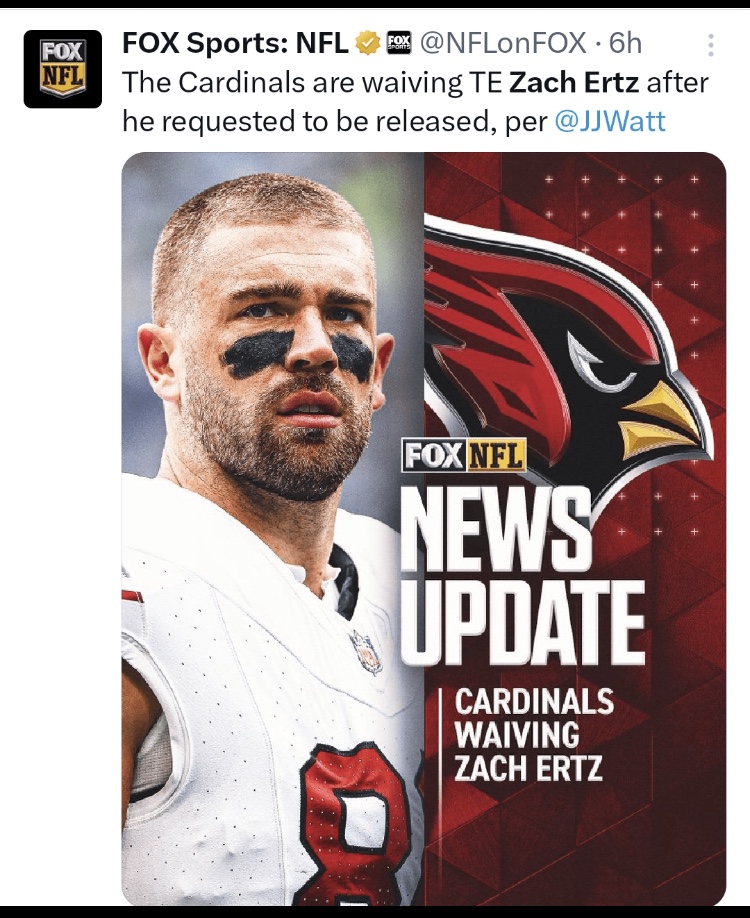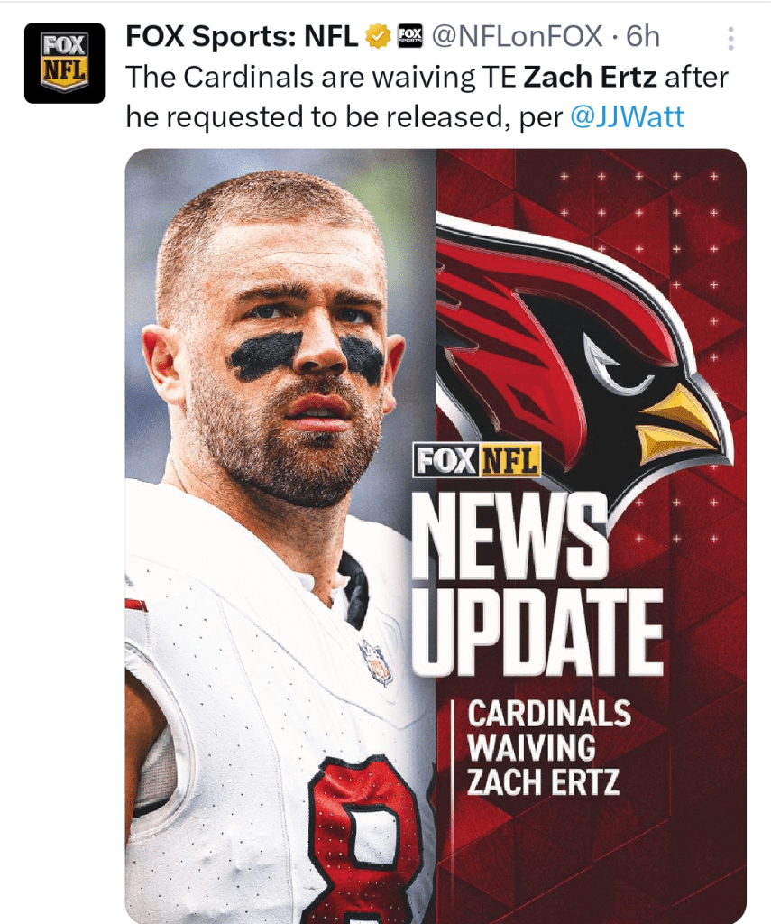 The NFL could be rebranded as News Frequently Loading as there are very few dull moments. Late breaking news has emerged that former AZ Cardinals TE Zach Ertz asked and was granted a release, per retired NFL DT @JJWATT.