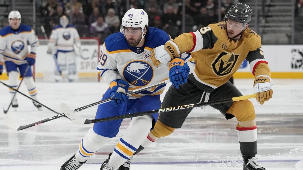 Former Golden Knight Alex Tuch and Zach Benson scored goals in the third period. Additionally, Dylan Cozens scored in the first period and had two assists.
