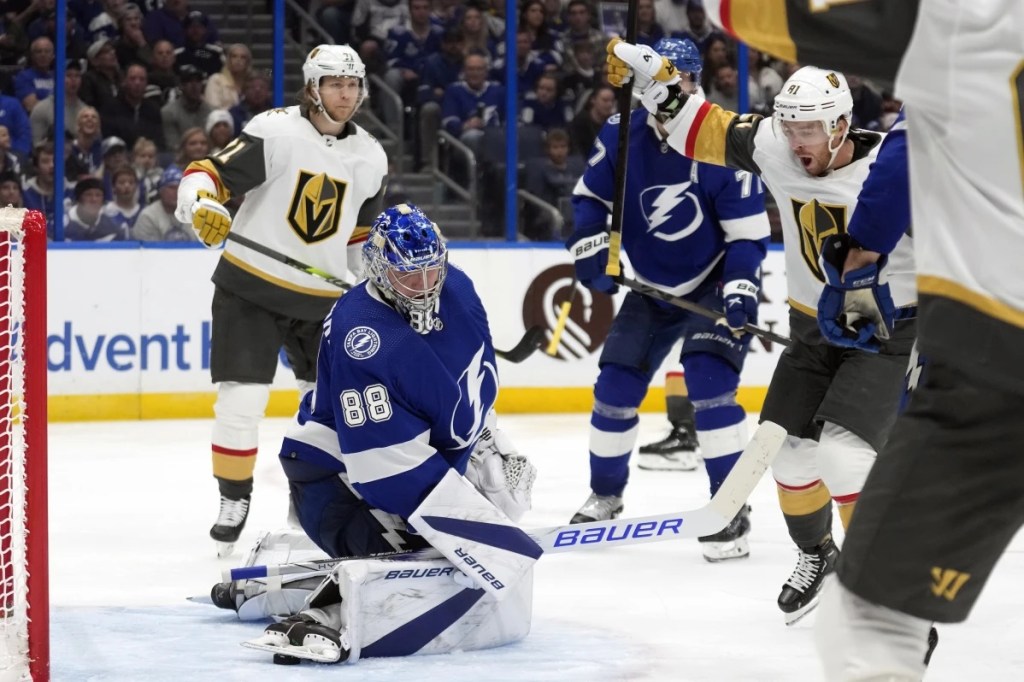 At 9:44 in the third Paul Cotter capped a shift full of pressure from Vegas. He beat Vasilevskiy with a shot through a heavy screen in front.