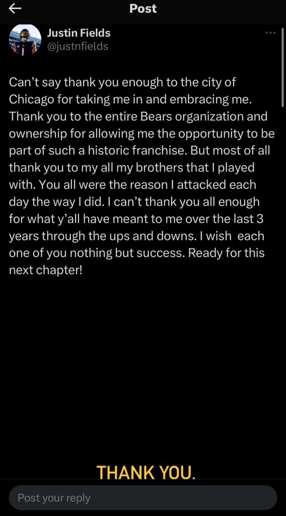 Since being selected 11th overall in the 2021 draft, Fields has accumulated a 10-28 record as a starting quarterback. He departs Chicago having thrown for 6,674 yards, 40 touchdowns, and 30 interceptions, while adding 2,220 yards and 14 touchdowns on the ground.