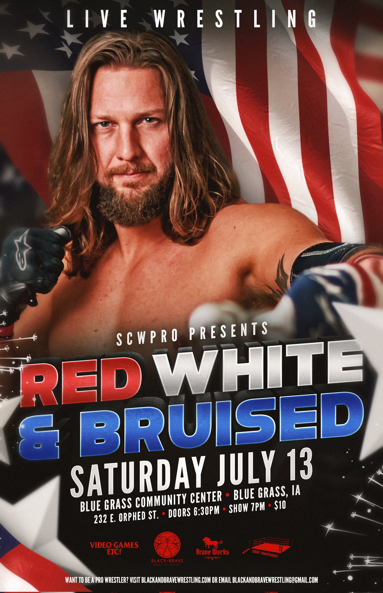 On July 13th, the people braved the heat to come out to the Blue Grass Community Center in Blue Grass Iowa to watch SCW Pro’s Red, White, & Bruised!