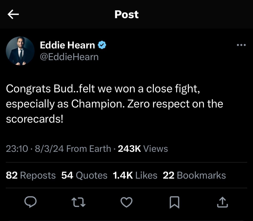 Everyone didn’t feel the same, as Eddie Hearn ripped judges for what he saw as a clear decision for the champ Madrimov.