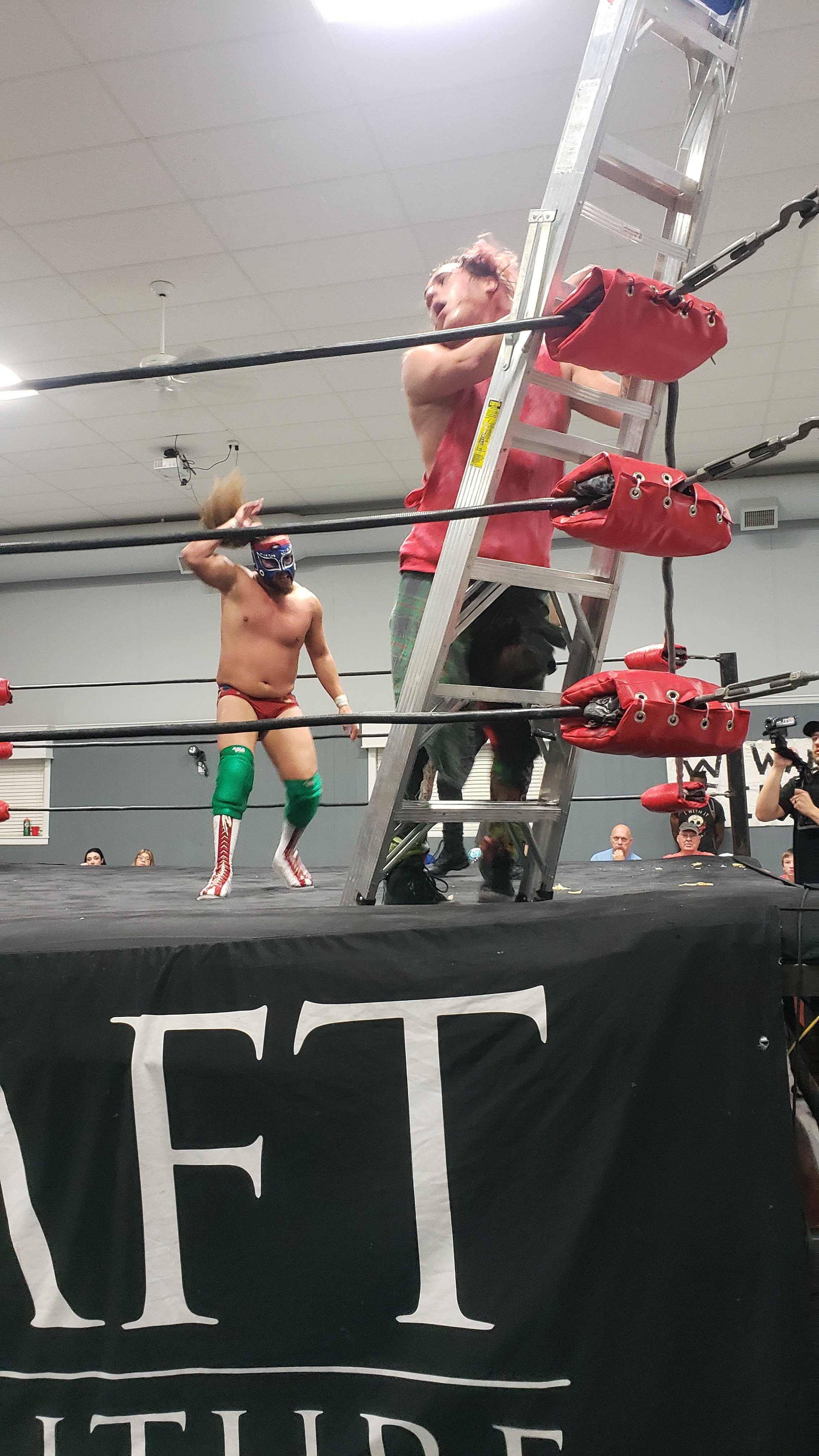 Part one of this match did not last long, as Leon decided that the best way to lose the match was to punch Corn Boi in the nether region right in front of the referee. That’s certainly one way to not win the championship. Corn demands a street fight after accusing Leon of having a lack of huevos. We get the go ahead and the match is restarted under street fight rules. A plunger, crutch, & kendo were put into use. Corn Boi was also locked out of the community center as well. Once all the competitors were back in the community center, we got doors, ladders, and chairs. The champion and challenger climbed the ladder, precariously placed above a “table” made of the door and two chairs. Corn Boi decided it wasn’t enough to just choke slam Leon through the door, but also decided to finish the challenger with a front dropkick halfway up the ladder to retain the championship.