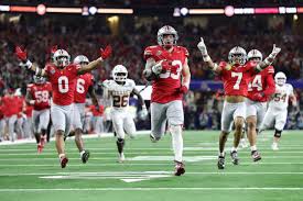 In the other semifinal, the Cotton Bowl saw an intense battle between the Ohio State Buckeyes and the Texas Longhorns. Ohio State, seeded eighth, managed to down Texas, the fifth seed, with a score of 28-14. The game was a back-and-forth affair, with Ohio State’s defense coming up clutch in the final moments. The big play came when Ohio State’s Jack Sawyer forced a fumble from Texas quarterback Quinn Ewers, which he then returned for a touchdown, effectively sealing the game. This victory ensured Ohio State’s advancement to face Notre Dame in Atlanta for the national championship.