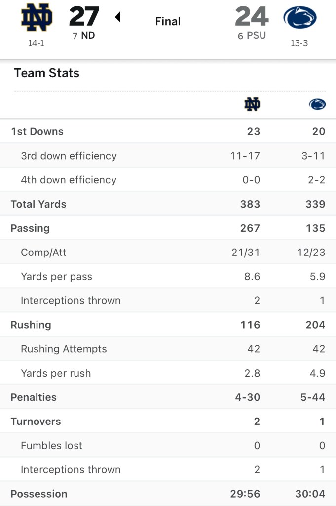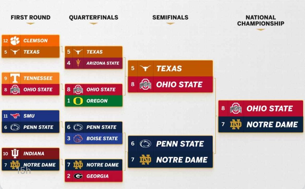 Notre Dame entered the playoffs at 11-1 as the seventh seed. After a convincing round 1 win over Indiana, the Irish proved they belong on the national stage with a 23-10 win against the Georgia Bulldogs in the Sugar Bowl. This was Notre Dame’s first major bowl victory in over three decades. This set the stage for their semifinal showdown in the Orange Bowl with Big 10 powerhouse Penn State.