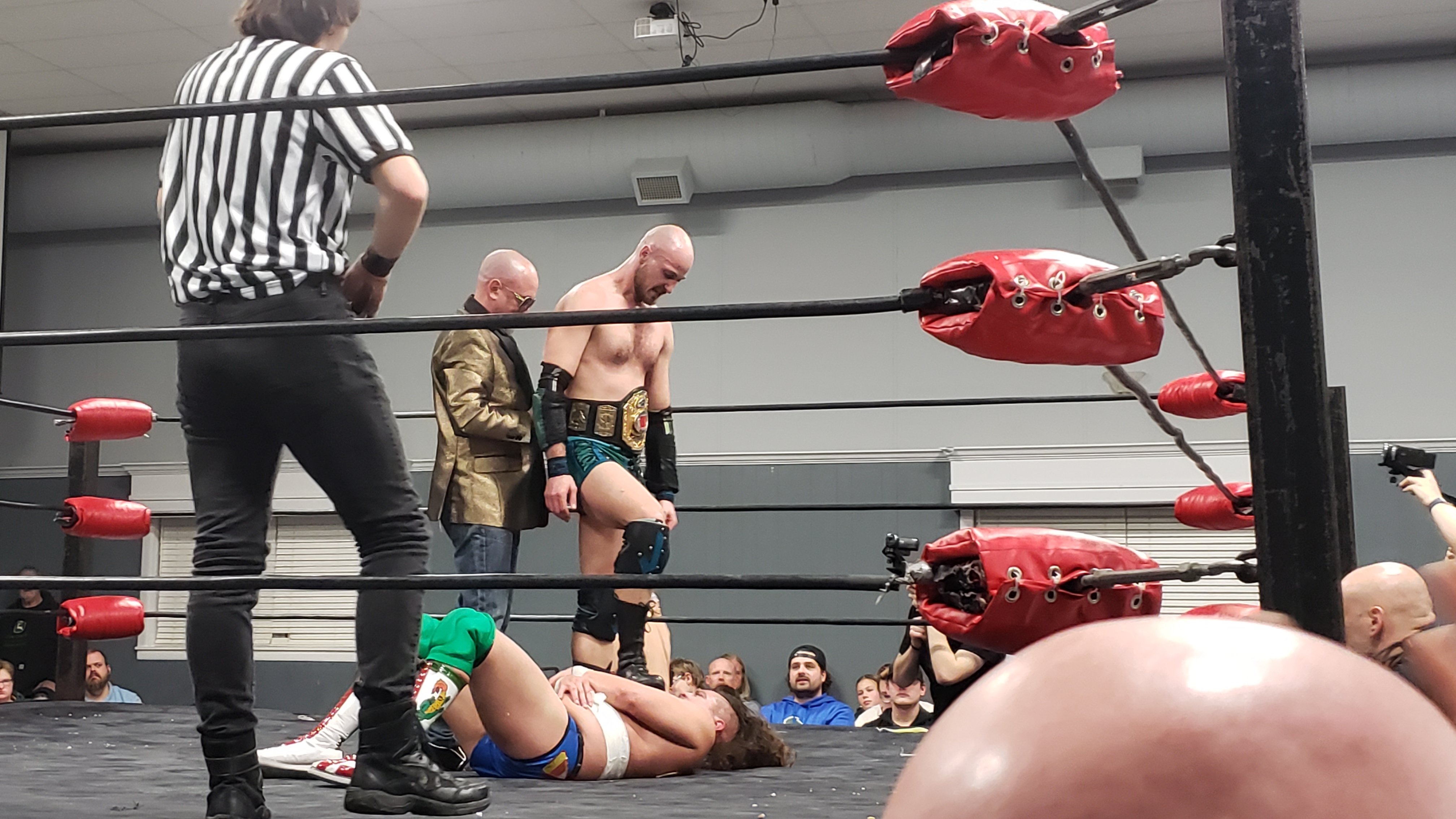 Corn Boi started the match smothering the challenger, releasing months of frustration. However, Mark Storm gave a needed distraction to allow Bonhart to take over. Despite Bonhart’s innovative offense, the champion refused to quit. Corn Boi even managed to fight back and looked to have victory in hand when Mark Storm tossed a shoe into the ring, distracting the referee long enough to allow Bonhart to hit a spear with the Iowa Championship draped over his shoulder to end Corn Boi’s second reign as champion. Bonhart and Storm stood tall over the fallen, former champion.