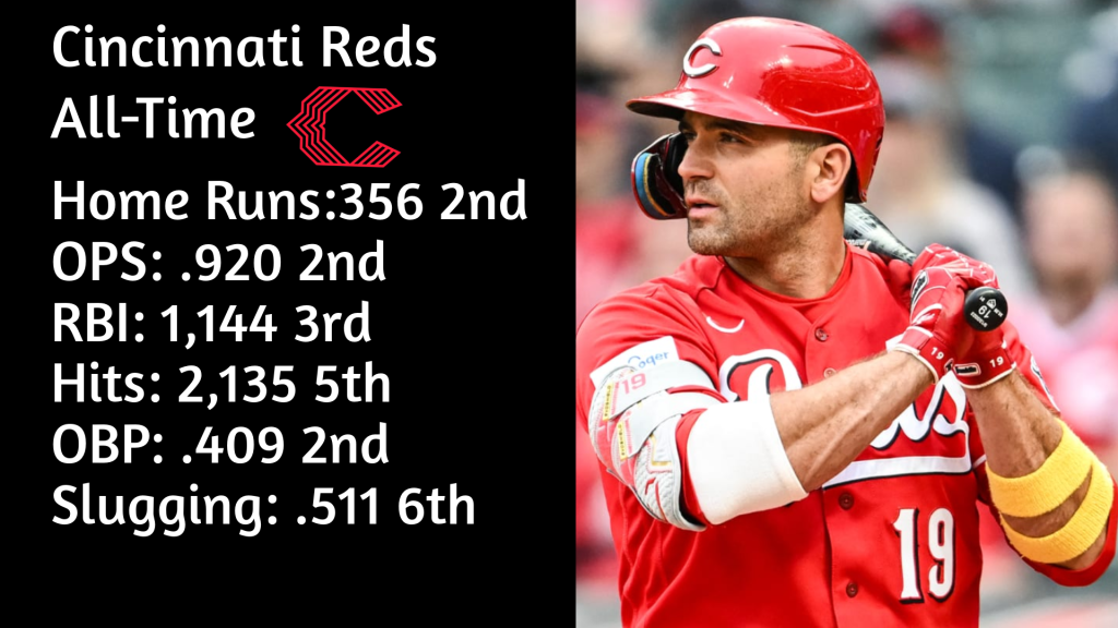 There were so many great moments in Joey Votto’s career, it would probably take multiple articles talking about them. From 2011-2019, Joey Votto slashed .304/.428/.506 with an OPS+ of 150. On Mothers Day in 2012, Votto would hit 3 home runs in a game, capping it off with a walk off grand slam. Joey would finish 3rd in MVP voting in 2015, 7th in 2016 and 2nd in 2017. 2017 was unbelievable. Joey slashed .320/.454/.578 with a 178 OPS+. He hit 36 home runs, 100 RBI’s, 34 doubles, he walked more than he struck out (134 walks-83K’s). In the first half on 2017, Votto slugged .631 with 26 home runs and 19 doubles. He walked 62 times and only stuck out 42 times. His OPS+ was 180 in the first half. The second half saw a .327/.486/.510 split. His power dropped a bit, hitting 10 home runs in the second half but overall his season should have ended with his second MVP award had the Reds not lost 94 games. Joey finished with an 8.1 WAR, far and away the best in the team and it wasn’t particularly close. Joey Votto was solidifying himself into the Reds history books, a deep and storied Reds history book.