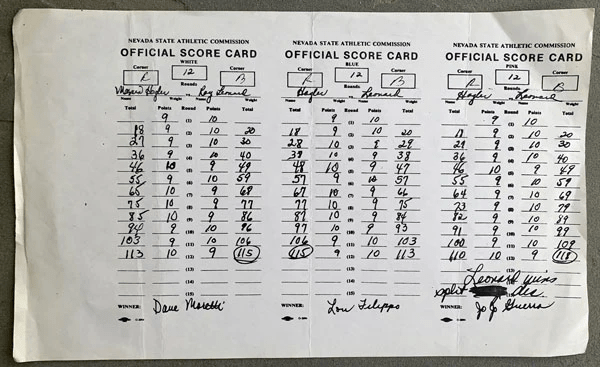Various “unofficial” judges had the fight scored in many different ways. However, it was the official judges results that counted, despite the hot debate through Las Vegas and the world as to who won this fight. Those official scorecards were: Lou Filippo 115-113 Hagler, JoJo Guerra 118-110 Leonard, and Dave Moretti 115-113 for Leonard.