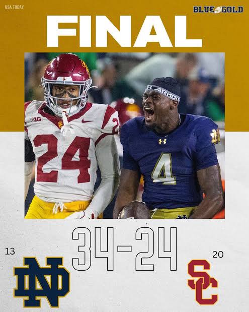 The Irish ran all over USC, showcasing the tandem of running backs Jeremiyah Love and Jadarian Price, who led the backfield to 306 total rushing yards and three touchdowns. Quarterback CJ Carr, added 136 passing yards, a rushing touchdown, and a passing touchdown.