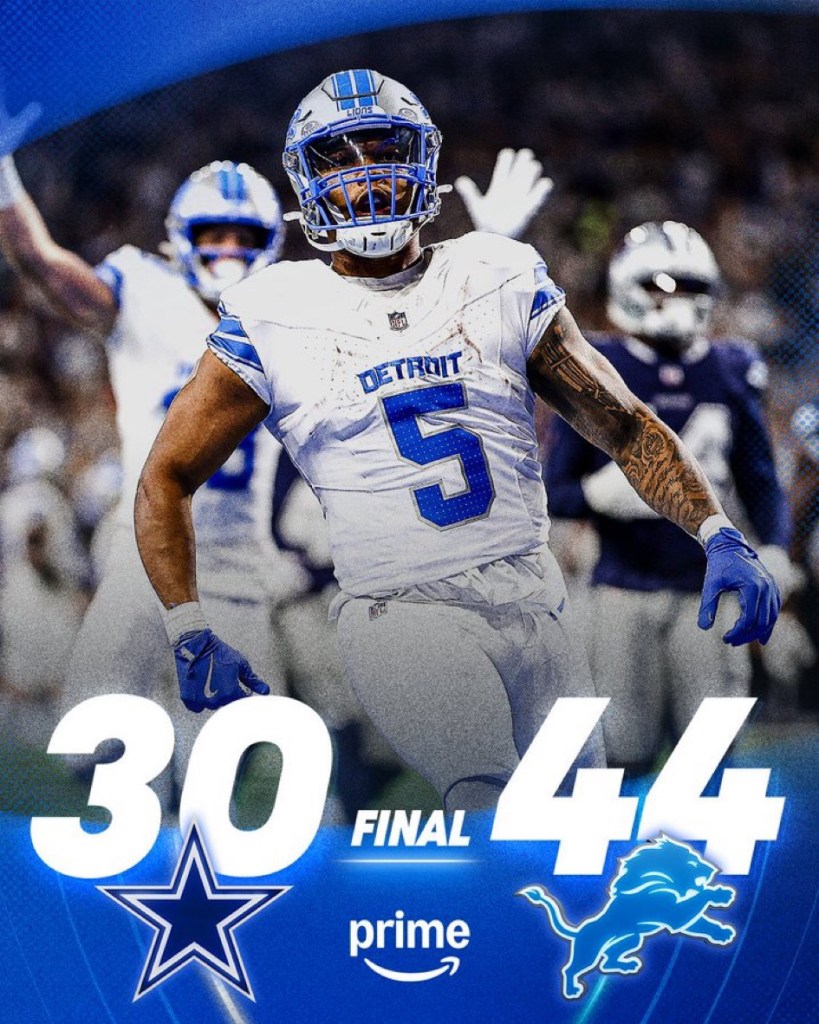 In a electric night at Ford Field, the Detroit Lions handed the Dallas Cowboys a decisive 44-30 defeat on Thursday Night Football the Lions boosted their playoff chances while dealing a severe blow to Dallas’ chances. The game showcased the Lions’ explosive offense led by running back Jahmyr Gibbs, who rushed for three touchdowns, and quarterback Jared Goff, who threw for 309 yards. Despite a big night from Cowboys quarterback Dak Prescott, who passed for 376 yards, turnovers and defensive lapses proved costly for Dallas, dropping their playoff odds to just 8% according to Next Gen Stats.